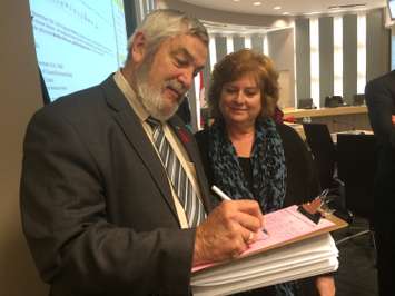 Essex Mayor Ron McDermott (L) in Council Chambers at the Essex Civic Centre on November 5, 2014 signing a petition handed out by Kingsville Deputy Mayor Tamara Stomp (R) opposing the pending closure of the obstetrics ward at Leamington District Memorial Hospital. (Photo by Ricardo Veneza)