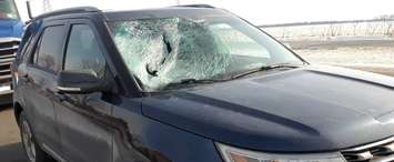 Chatham-Kent OPP said a piece of ice fell from the roof of a tractor trailer and smashed into this vehicle's windshield on February 2, 2019. (Photo courtesy of Chatham-Kent OPP)
