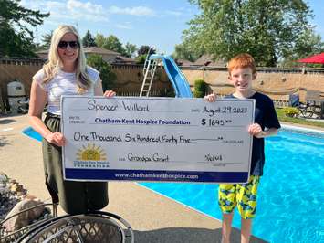 Spencer presented the funds he had raised to Katherine Stinson from Chatham-Kent Hospice at his grandmother's residence in Tilbury on August 29.
