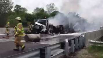 Fiery crash on Hwy. 402 Thursday. Photo submitted by Elaine Creasor Marcoux via Facebook.