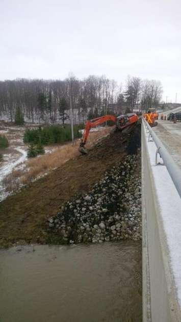 Saugeen Shores Police Sergeant Andy Evans tweets they are cleaning up a load of spilled asphalt at the Saugeen River.