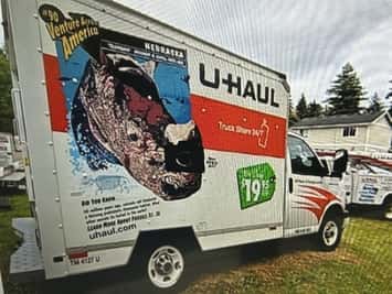 It is described as a 10-foot truck with the image of a Rhino and the word Nebraska printed on the sides of the box.
