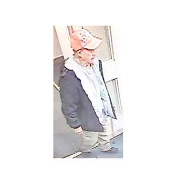 He was wearing a dark spring/fall jacket, a grey sweatshirt, beige pants, a red baseball cap and black or brown boots.