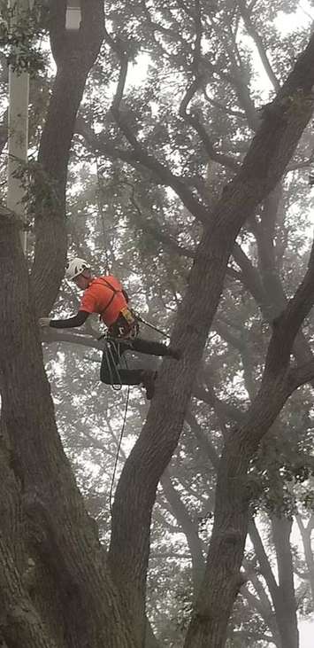 Mike Raaymaker, a member of the Ontario Tree Climbing Committee, said 25 men and ten women, equipped with harnesses, hard hats, and safety boots scrambled up large oak trees in the park.
