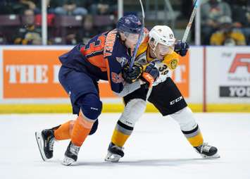 Winning goalie Aiden Hughes stopped 19 shots for Sarnia. Emmanuel Vella faced 50 shots in the Firebirds' net.