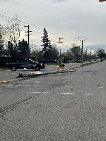 A photo shared by Sarnia police shows traffic lights knocked down on the roadway.
