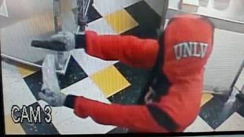 The suspect is described as a male, 5'8" to 5'10", wearing a black mask, red or orange sweater with an UNLV logo and black pants.