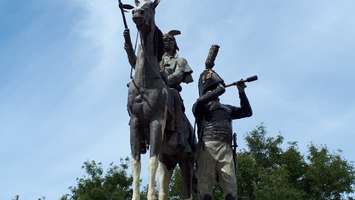 The statue was designed by Mark Williams, and it shows Major General Isaac Brock, using a scope to survey the American shore. Shawnee chief Tecumseh is on horseback, watching a British artillery position that is bombing the fort at Detroit during the War of 1812.