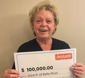 June Prieur won the top prize in the Instant Crowns scratch-off game. She picked up her $100,000 prize cheque at the Ontario Lottery and Gaming (OLG)'s Prize Centre in Toronto.