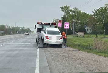 A patrol officer was on Highway 3 in Tecumseh on Tuesday morning when they spotted a speeding vehicle passing other cars on the centre lane, with a light rain falling.
